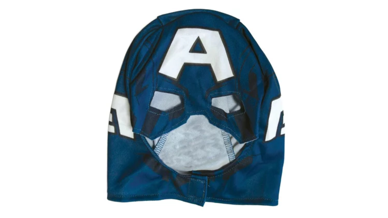 Glugă din spumă asortată cu designul Căpitanului America, cu închidere cu velcro sub bărbie și în zona ochilor.