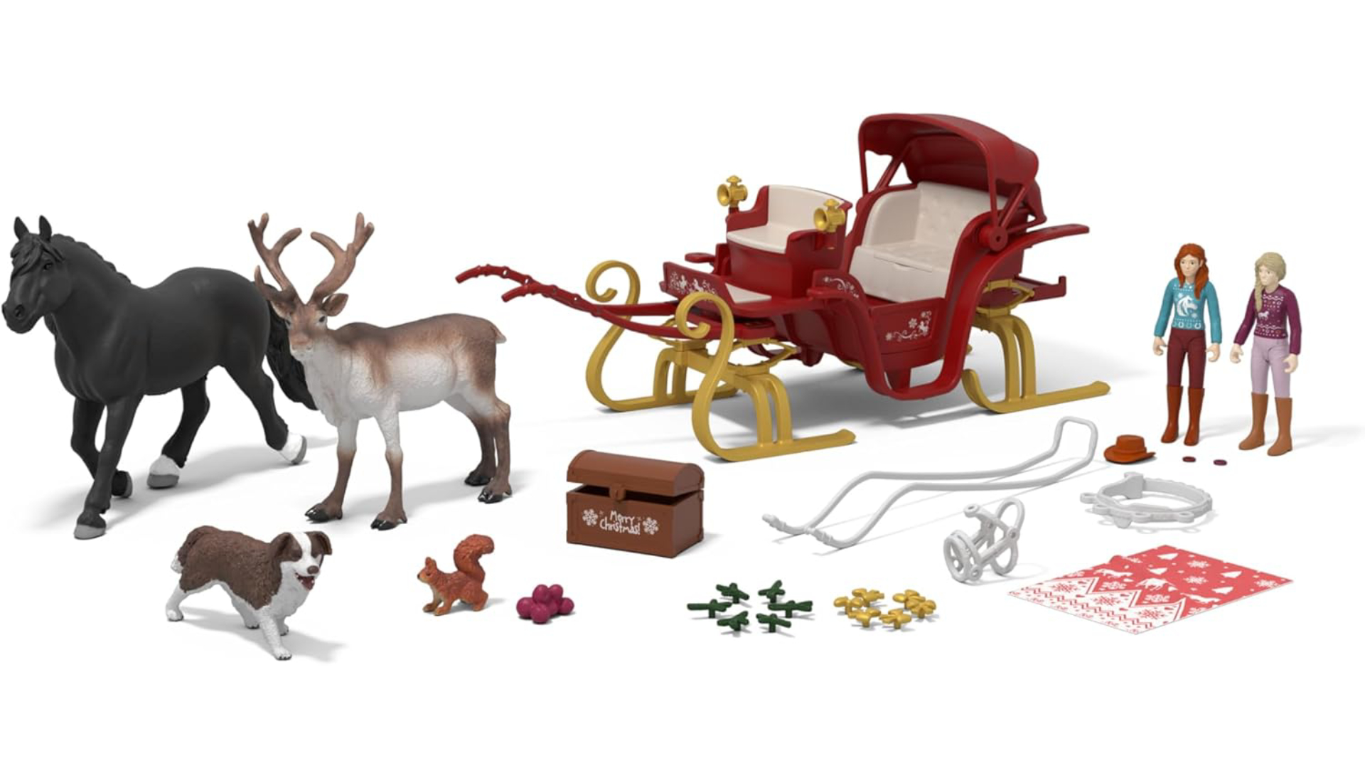 Include o trăsură roșie, un cal, un ren, un câine, 2 figurine poziționabile și o mulțime de accesorii de sărbători pentru 31 de zile de surprize magice înainte de Crăciun.