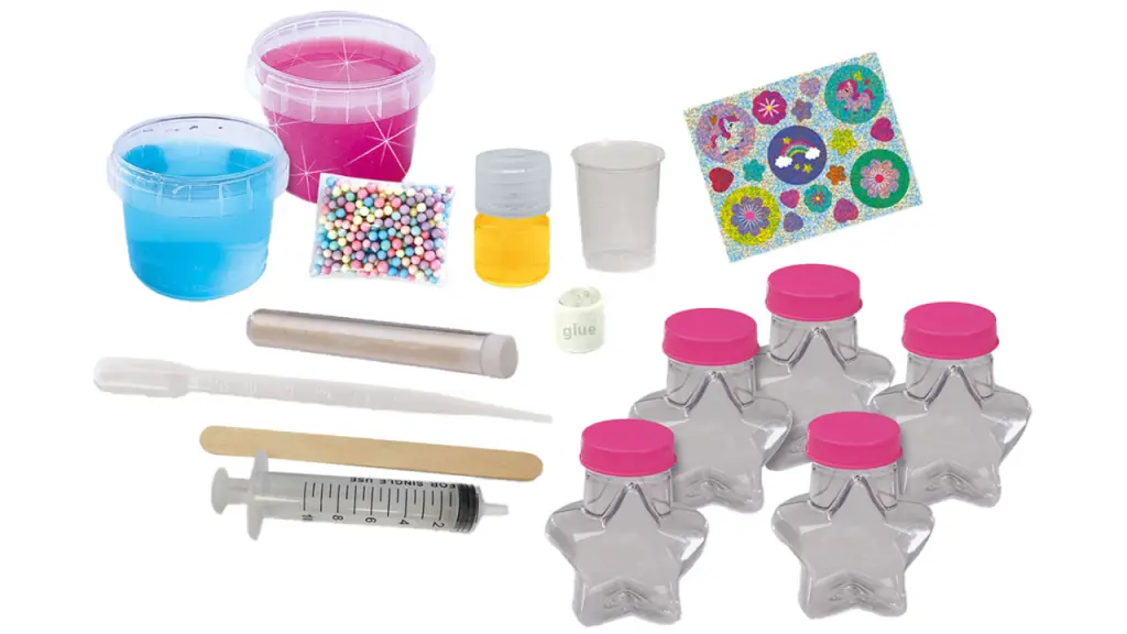 Include slime roz cu sclipici, slime albastru transparent, o cană de măsurat, pudră de slime, foaie cu abțibilduri strălucitoare, sticle în formă de stea, o cană de lipici, un bețișor de amestecat, o pipetă, o seringă, Aqualine galbenă și instrucțiuni simple.