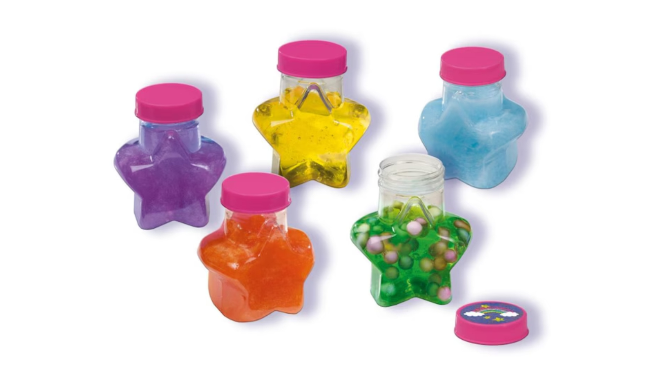Amestecă pudra de slime cu Aqualine, adaugă sclipici și culori și depozitează-ți creațiile în sticlele în formă de stea.