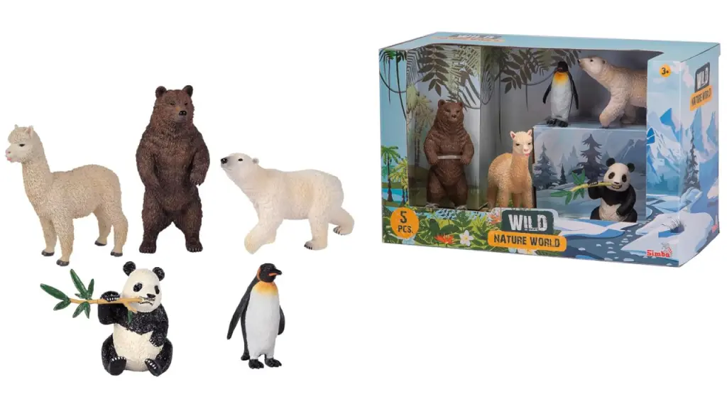 Explorează lumea sălbatică cu acest set de animale sălbatice care include un urs brun, un urs polar, o lamă, un panda și un pinguin!