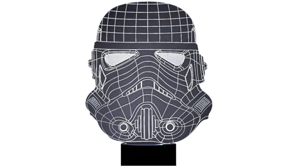 Folosind un plan de design inteligent, liniile care creează caracteristicile binecunoscute ale unei căști Stormtrooper sunt iluminate de lumina din interior imediat ce lampa se aprinde.