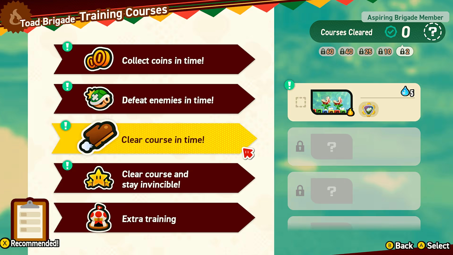 Brigada Toad a înființat o tabără de antrenament în Tabăra Centrală! Până la patru jucători pot face față tot felul de provocări aici, pe trasee din aventura principală.