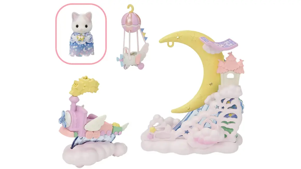 Setul include pisica Latte în leagăn pentru bebeluși, plutitor lunar, trenuleț cu aburi, navă cerească pentru bebeluși.