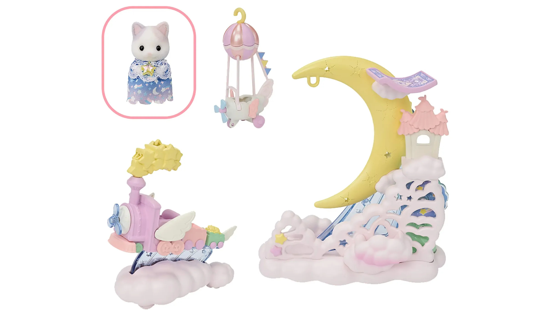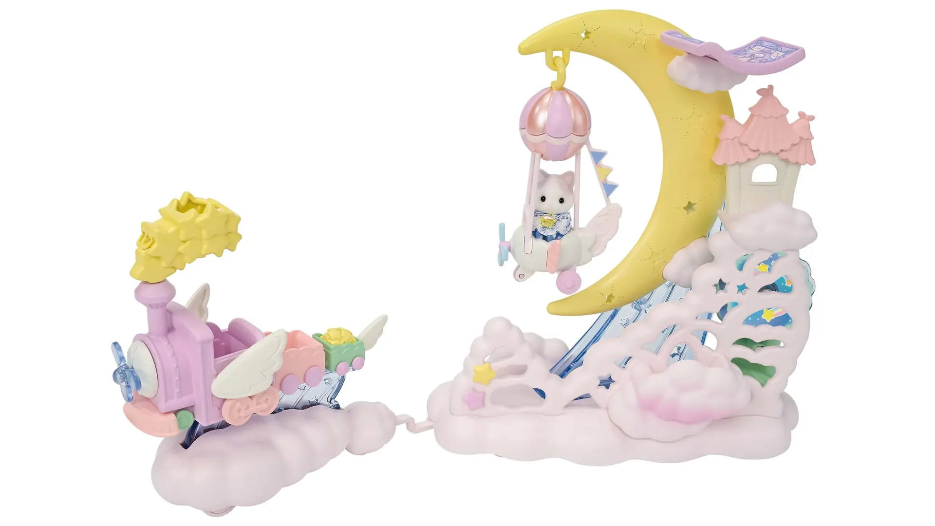 Setul de joacă Daydream Parade pachetul include un dirijabil pentru bebeluși în formă de lună, un trenuleț în miniatură și o pisică bebeluș.