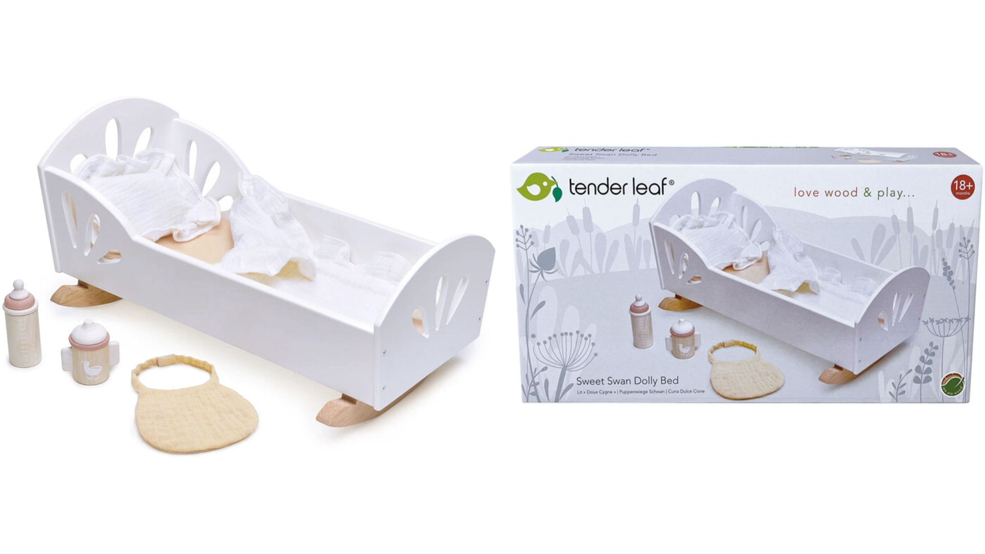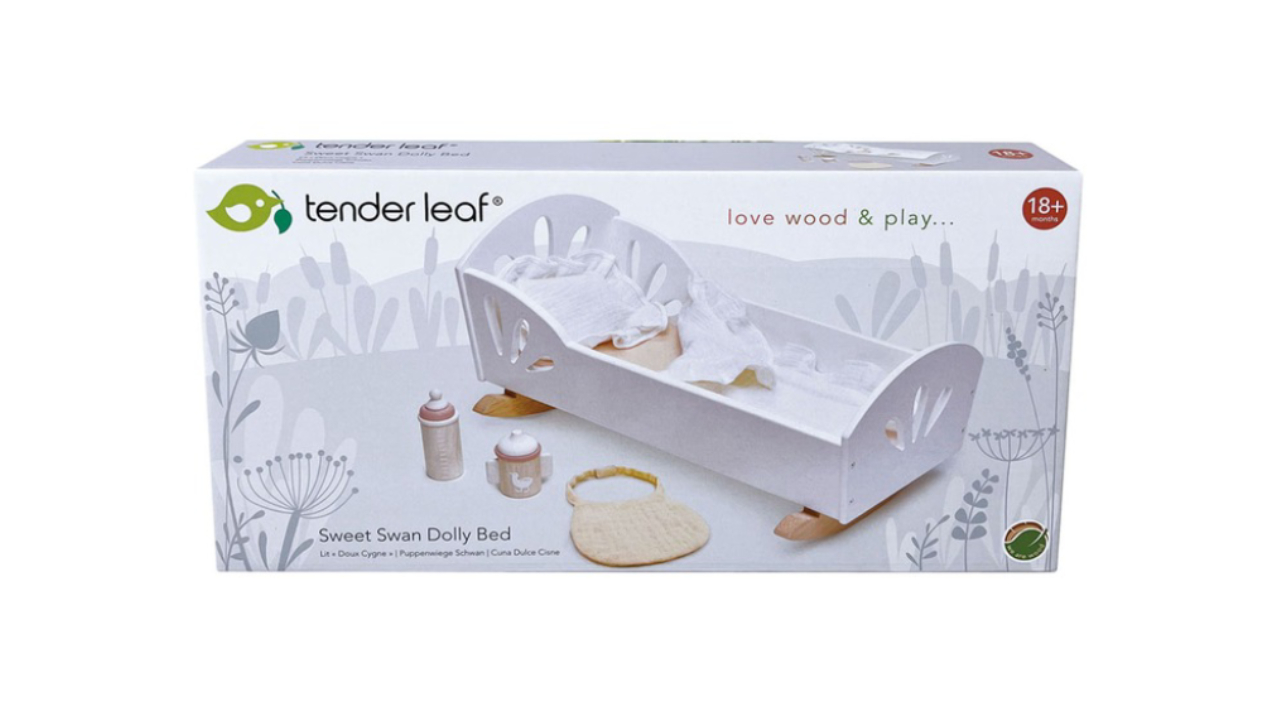 Pentru cei mici și pentru a se juca de-a tatăl și mama începând de la 36 de luni, trezirea emoțională și imaginația cu acest accesoriu drăguț pentru păpuși, pătuț din lemn Petit cygne Leaf Toys.