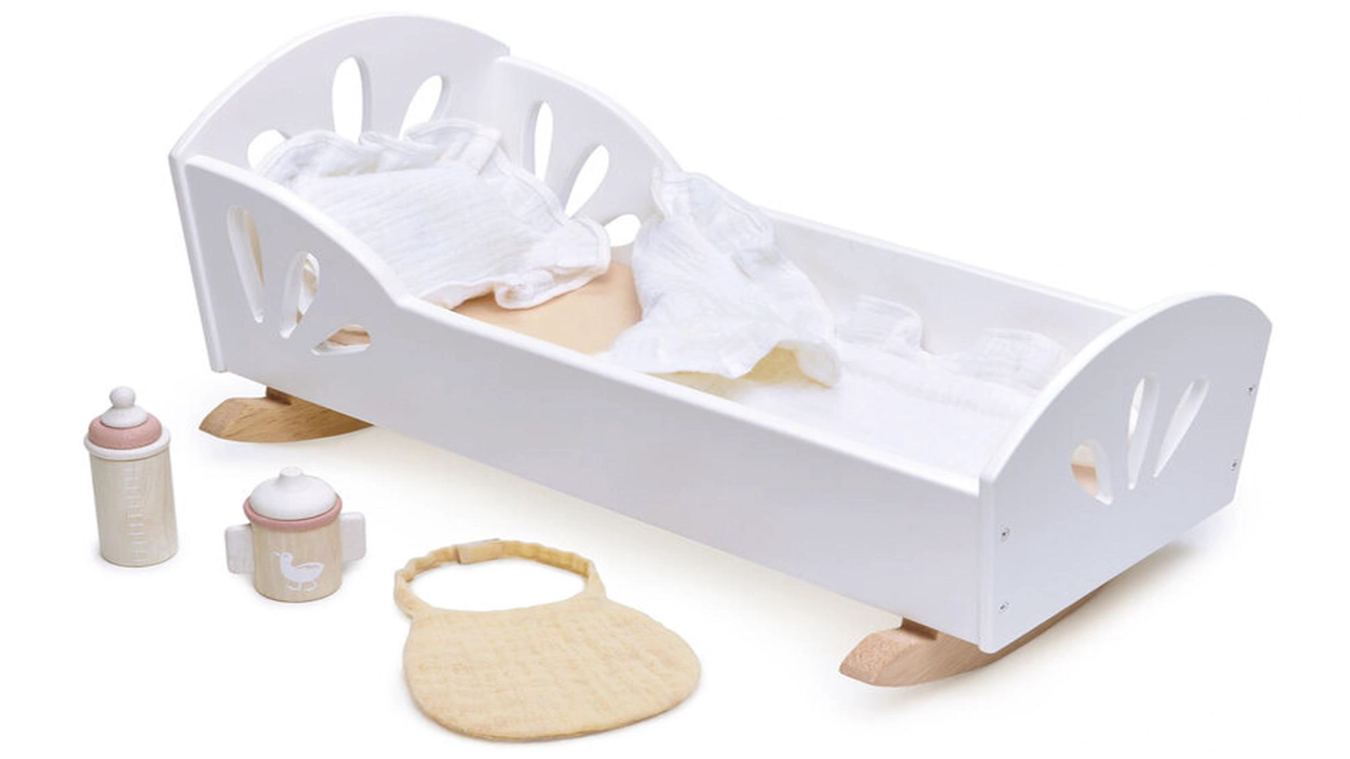Un pătuț pentru a legăna jucăriile de pluș și păpușile. O mică lenjerie de pat din bumbac și 3 accesorii adorabile (biberon, pahar cu apă, bavetă) vor face momentul și mai realist.