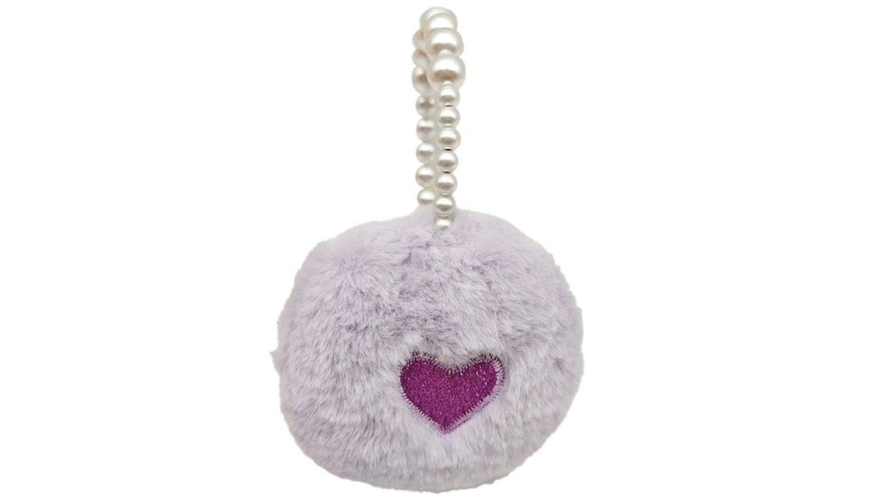 Căști mov cu motiv de inimioara și o bandă decorativă din perle care adaugă o notă unică și elegantă.