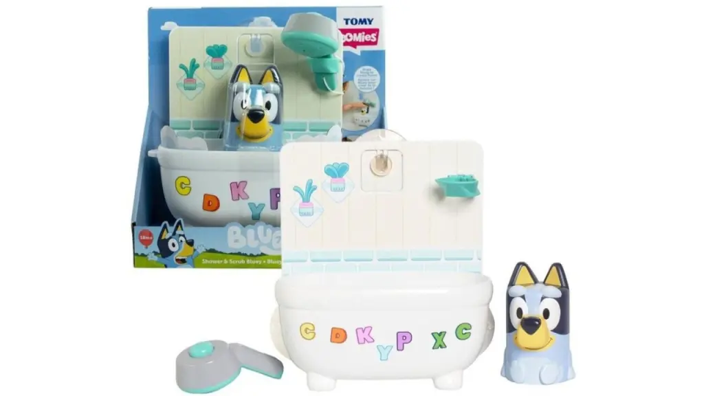 Lui Bluey îi plac băile, exact ca ție! Cu jucăria de baie TOMY Toomies Shower and Scrub Bluey, baia se transformă într-o aventură distractivă și interactivă.