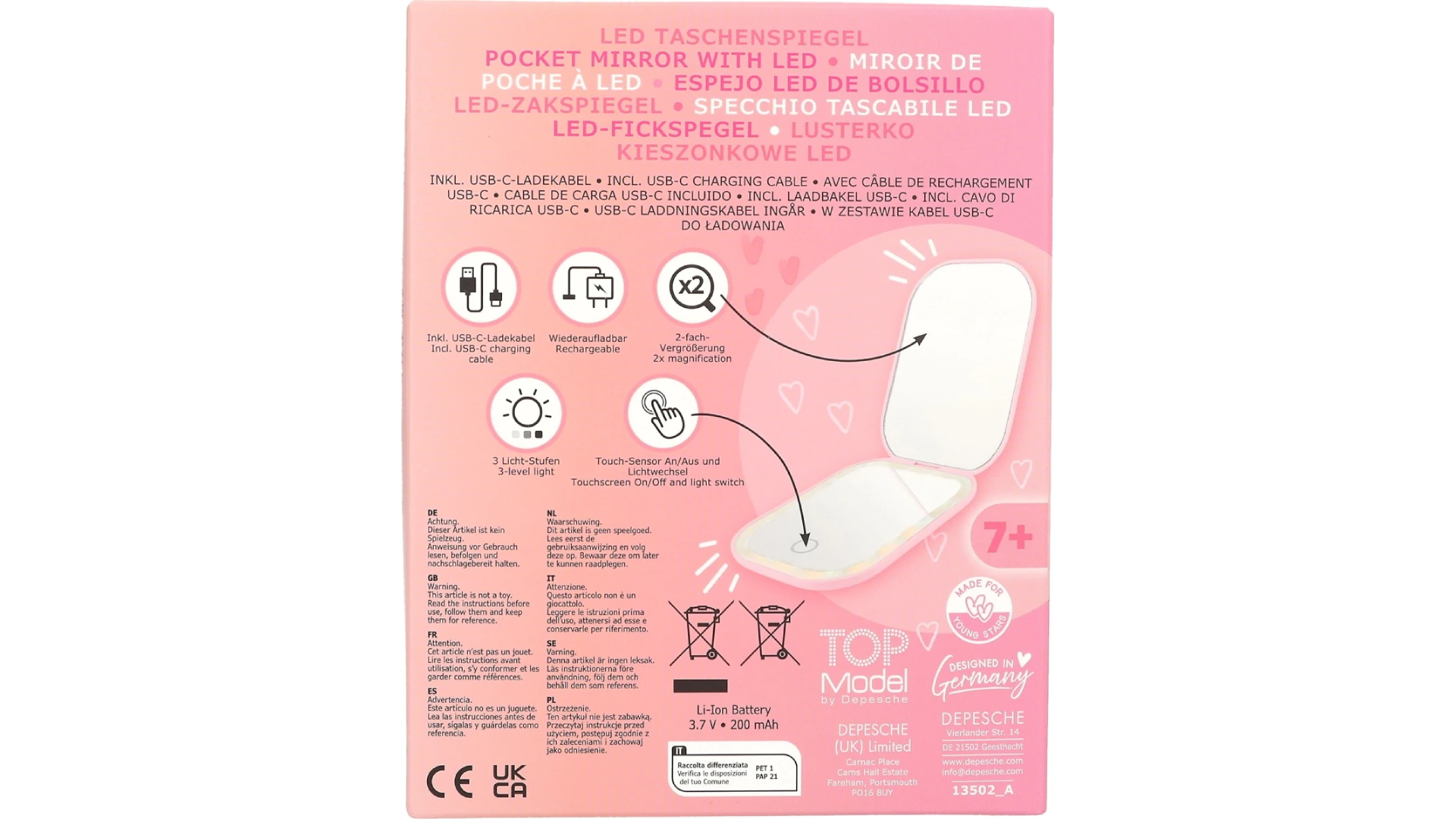Oglindă de buzunar TOPModel cu funcție de mărire și lumină de înfrumusețare perfectă pentru călătorii.