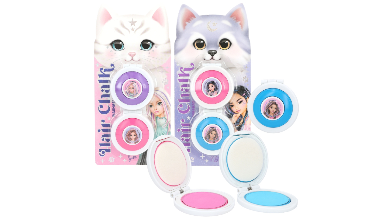 TOPModel Hair Chalk Set Beauty and Me este un set creativ de șiruri de vopsea temporară pentru păr în nuanțe vibrante, fie Purple și Pink, fie Pink și Blue.