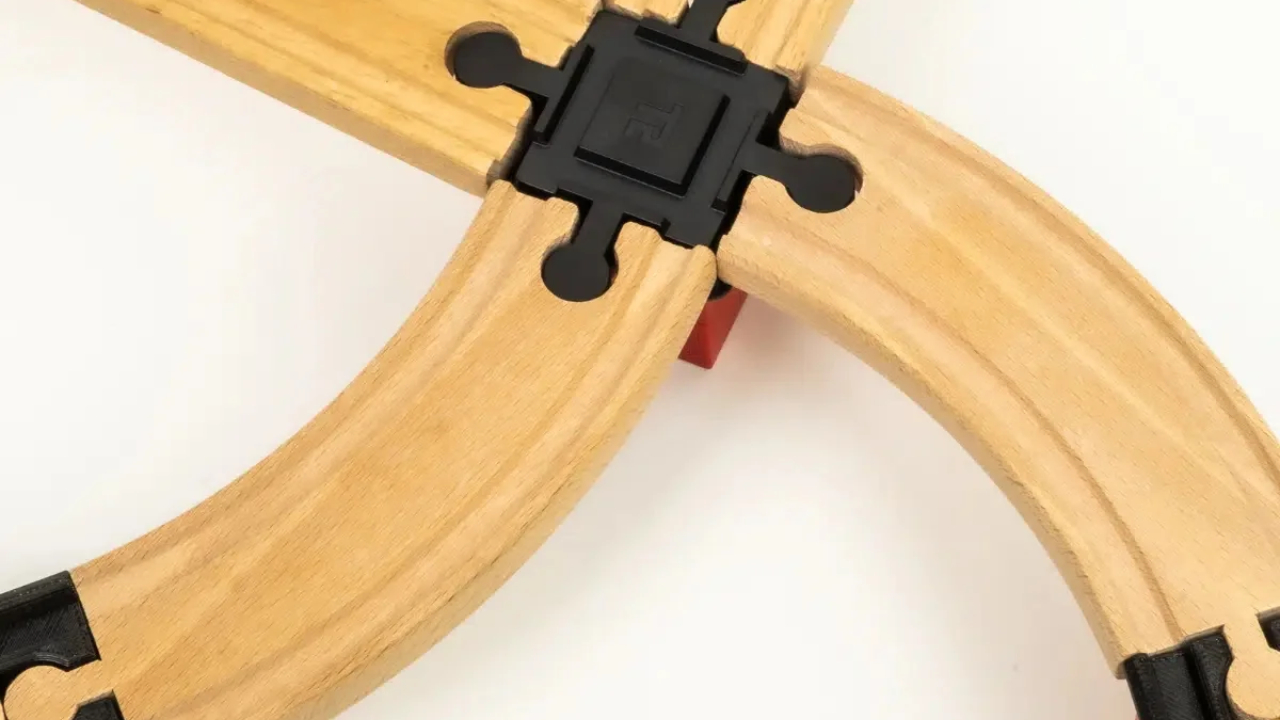 Conectorii de șină îndoiți ancorează șinele de lemn de jos. Șinele de lemn îndoite și joncțiunile în Y au adâncituri în partea de sus și de jos. Acești conectori de șină se ancorează singuri în aceste adâncituri.