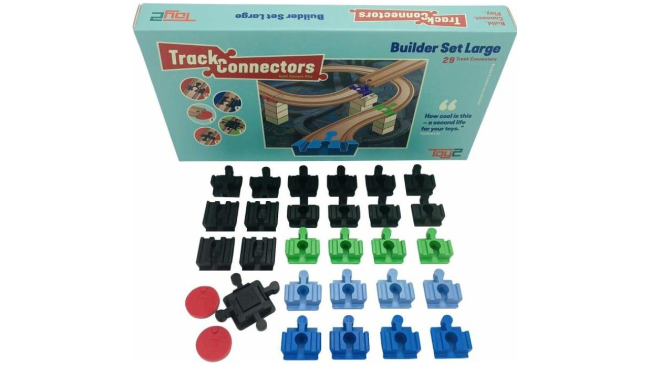 Conectorii de șine TOY2 oferă începătorilor și constructorilor experimentați oportunitatea de a crea structuri unice cu blocuri de construcție din plastic și căi ferate din lemn.