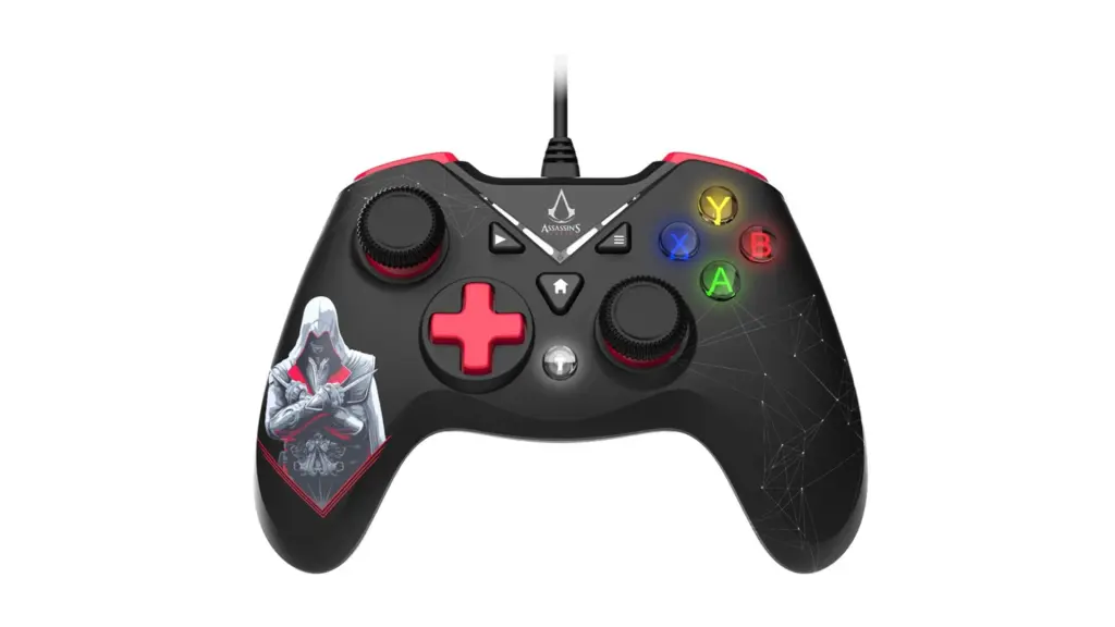 Descoperă controlerul USB cu fir pentru PC Assassin's Creed, cu cablu de 3 m, negru și roșu, disponibil la Référence Gaming.