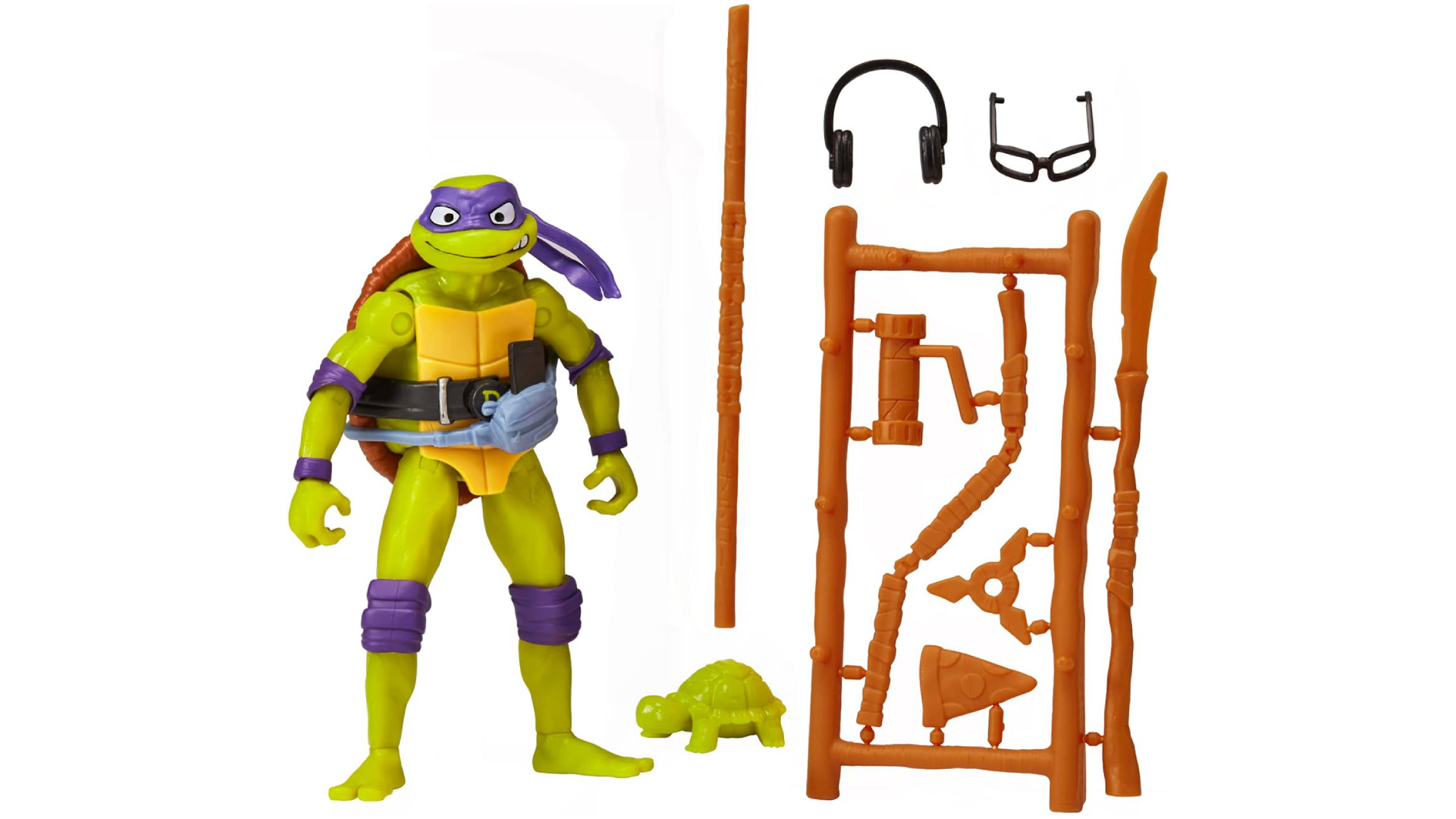 Donnie vine pregătit de luptă cu emblematicul său toiag bo, un suport separat pentru arme încărcat cu diferite accesorii și o broască țestoasă pui.