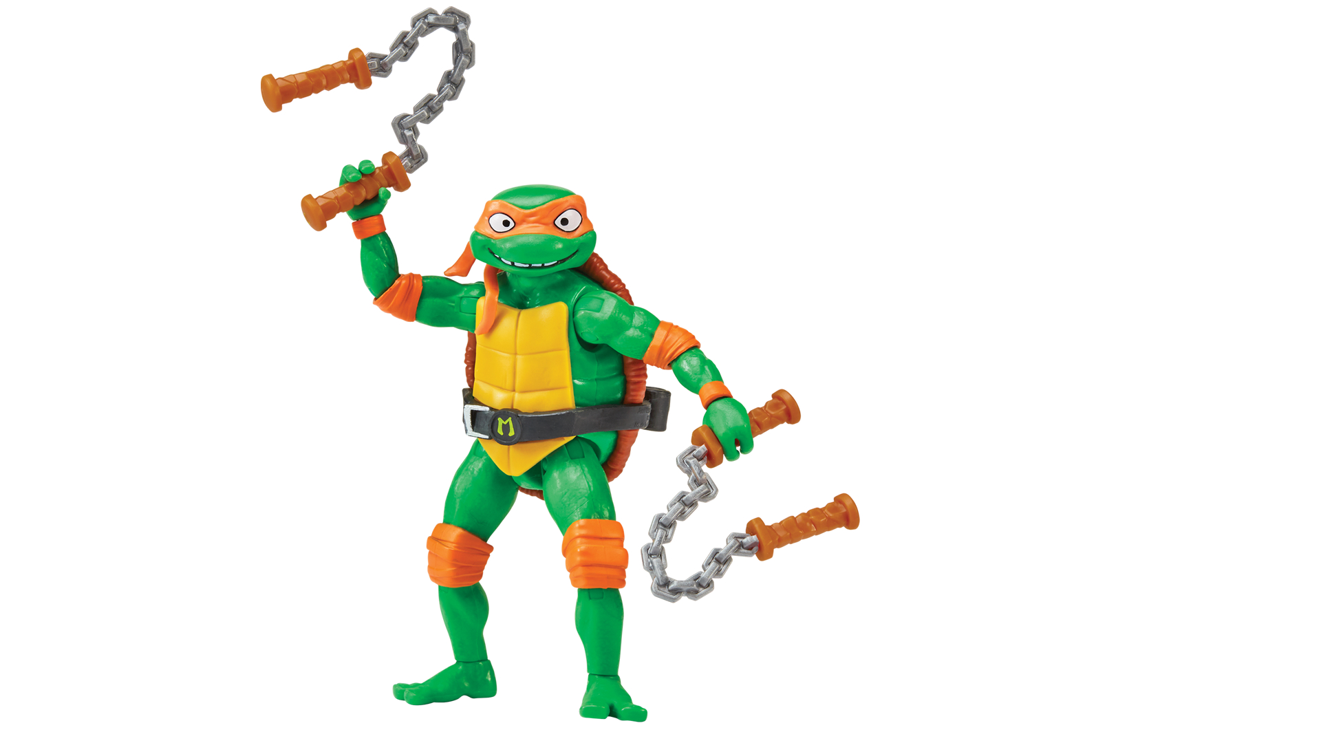 Mikey vine într-un ambalaj tip blister decorat intens, cu detalii strălucitoare și îndrăznețe, care includ branding-ul filmului TMNT Mutant Mayhem.