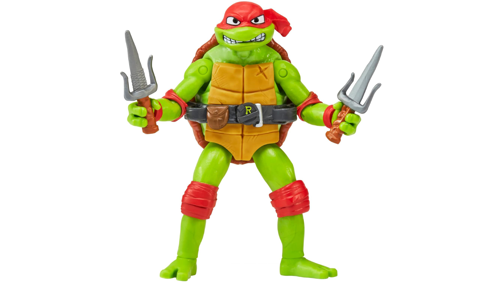 Raph vine într-un ambalaj tip blister decorat intens, cu detalii strălucitoare și îndrăznețe, care include brandingul filmului TMNT Mutant Mayhem.