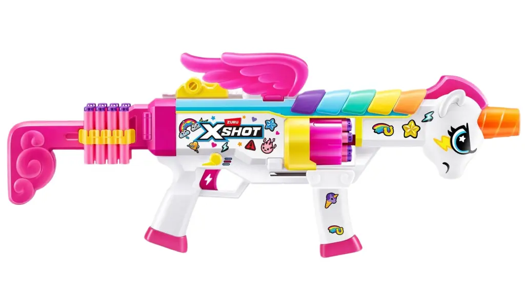 XSHOT Blastercorn vine într-un design cu tematică de unicorn, care adaugă farmec și jucăușenie aventurilor voastre cu blaster!