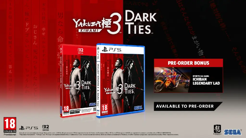 Precomandă Yakuza Kiwami 3 & Dark Ties și primești Legendary Lad, Ichiban Kasuga, care îl adaugă pe personajul favorit al fanilor, Ichiban Kasuga, în grupul Ryukyu Gal Gang.