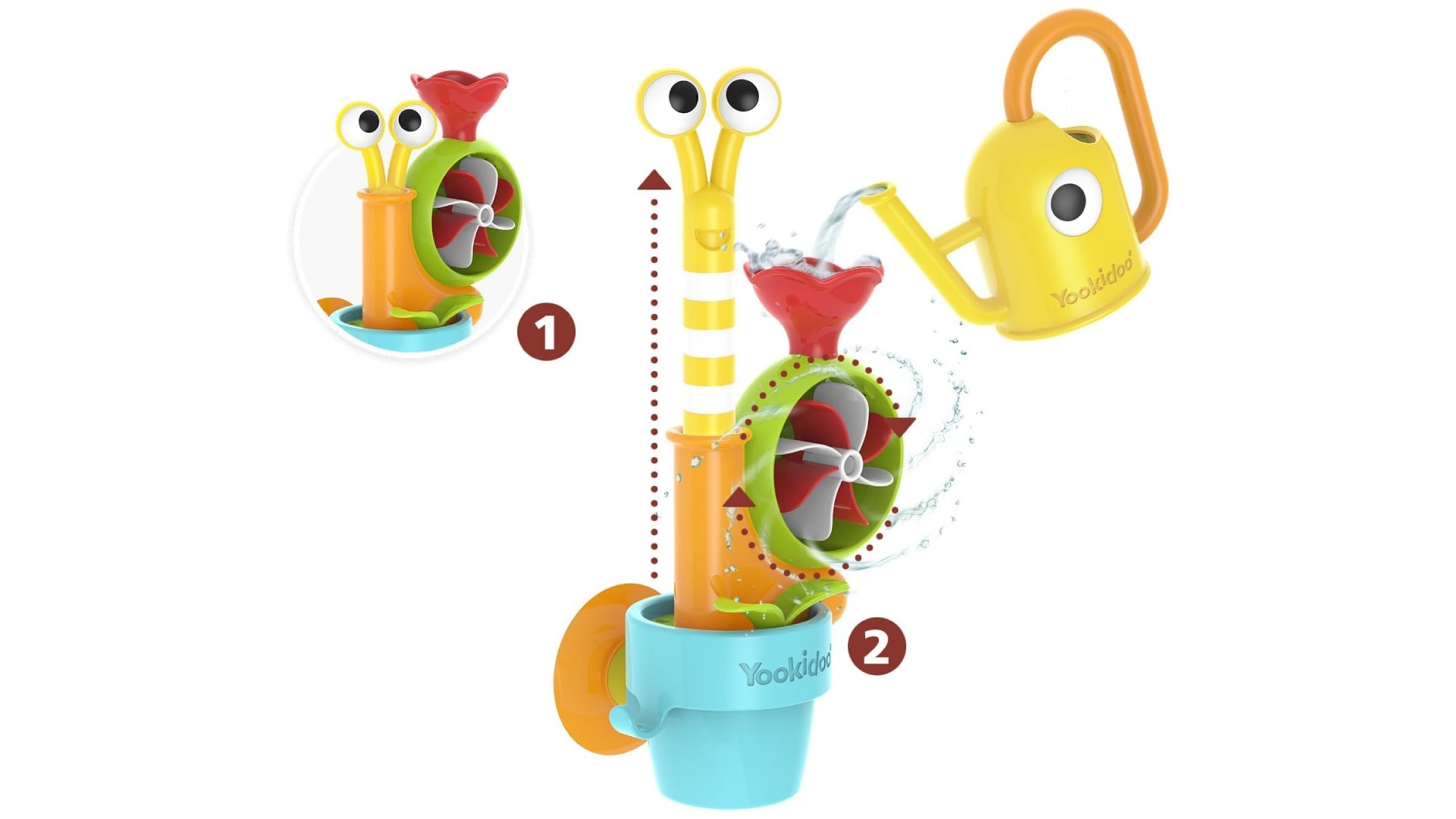 Un set de baie cu tematică de grădină, un ghiveci cu un melc ce își ridică ochii și o elice ce se învârte.